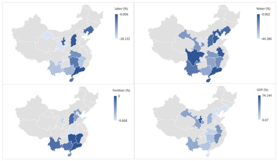 - During the study period, the labor force in agriculture decreased by 5.99%, and the fertilizer increased by 2.48%. The total area of arable land increased by 2.61%, water consumption decreased by 3.48%, and the gross production value increased by 24.14%. The empirical results of this study show that agriculture in all administrative regions of China is moving forward toward the policy implementation goals.