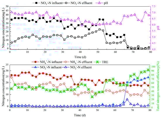 For days 1–10, the NH4+-N and NO2−-N concentrations in the effluent were significantly reduced compared to the influent, standing at approximately 20.8/26.0 mg·L−1 and 12.5/30.0 mg·L−1, respectively (Figure 4), while the TIN removal rate started at 47.5% and increased over time. For this period, the concentration of NO3−-N in the reactor did not change significantly (Figure 4).