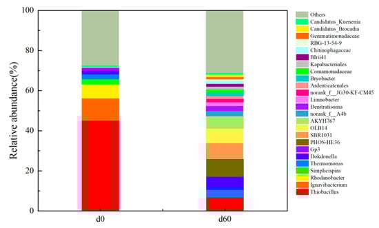 After the end of the S0-SADN operation stage, the genus with the highest proportion detected in the reactor was Thiobacillus, with a relative abundance of 45.06% (Figure 5). Members of Thiobacillus are obligate autotrophic bacteria with denitrification functions, widely distributed in soil and water, that can assimilate CO2 and oxidize the reduced sulfide to SO42− []. Ignavibacterium (11.11%) comprises green sulfur bacteria, most of which can oxidize sulfur or thiosulfate under anaerobic conditions, and so the genus has a role in S0-SADN. Rhodanobacter (6.99%) is a genus of both nitrification and denitrification bacteria, some of which can use sulfides as electron donors for autotrophic denitrification reactions [,]; it is suitable for a low pH, high nitrate concentration growth environment []. Thermomonas (2.43%) is a genus of heterotrophic aerobic denitrifying bacteria [], which are common in water treatment systems []. Dokdonella (1.84%) is also a genus of heterotrophic denitrifying bacteria [], which can use organic matter as a carbon source for denitrification. The reactor was stocked with a 0.80% abundance of the ANAMMOX functional bacteria Candidatus Kuenenia.