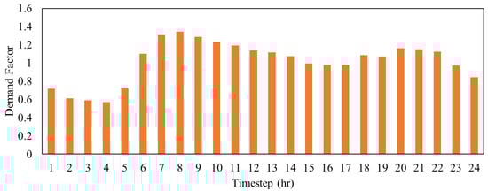 The chosen benchmark WDS (hereafter BWDS) comprises 126 nodes, 1 constant head source, 2 tanks, 168 pipes, 2 pumps, and 8 valves, and is subjected to normal water demand loading. An operational horizon of 24 h is considered in this study. BWDS is a real WDS that was twisted to preserve its anonymity. The network features are further modified in this study by adding 2.27 of water demand at each node, and modifying the water demand pattern to have no less than 20% (0.2 multipliers) of the base water demand at any time during the 24 h operational horizon (at night usually). These modifications were made to avoid negative values in the water demand forecasting model. The modified water demand pattern adopted from the literature is illustrated in Figure 3.