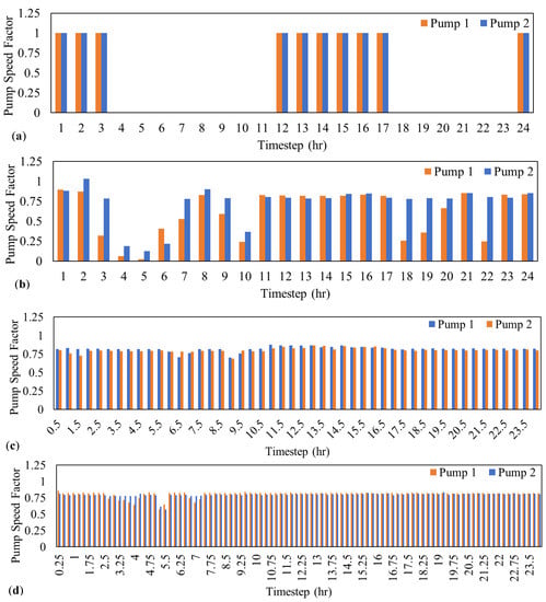The two pump schedules over the operational horizon: (a) baseline, (b) 60 min, (c) 30 min, and (d) 15 min.
