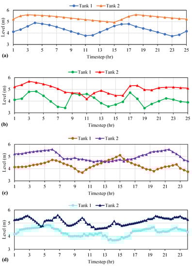 Tank levels profile over the 24 hour operation period for (a) baseline, (b) 60 min, (c) 30 min, and (d) 15 min.