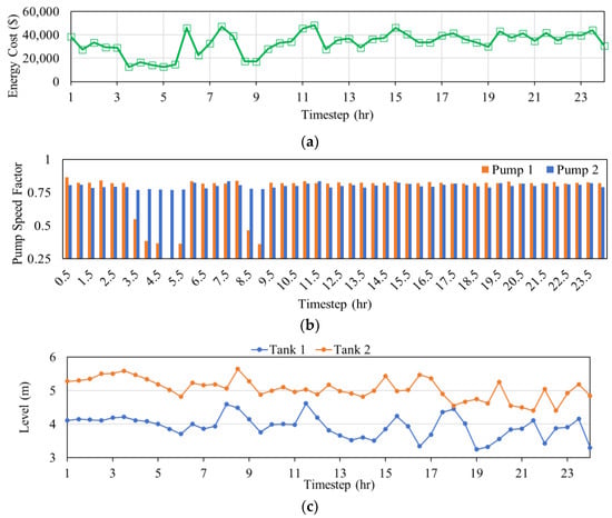 Figure 4 illustrates the schedules of both pumps for all the control schemes. Additionally, the pump energy profile over the 24 h horizon for all time steps is provided in Figure 5 to illustrate the kind of solutions the real-time control method produced.
