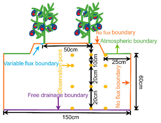 In this experiment, the groundwater was buried deep, so the influence of groundwater on the simulated area was not considered. Therefore, the lower boundary of this profile was selected as the “free drainage boundary”. The lateral boundary was set as “zero flux boundary”. The upper boundary was divided into film-covered zone and unfilm-covered zone. The film-covered zone was set as “zero flux boundary”, because it cut off the water transmission path between the atmosphere and the surface, and the unfilm covered zone was set as “atmospheric boundary”. The drip holes were set as “variable flow boundary”, which was determined by the actual irrigation volume. Each boundary condition is shown in Figure 2. Since the whole drip-irrigation belt can be regarded as a symmetrical distribution of wide row centers, the right half of the ridge was selected for simulation in this simulation.