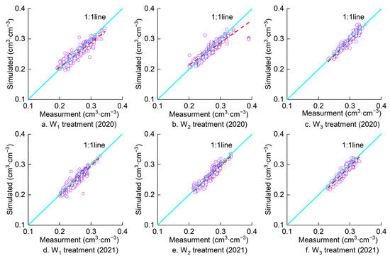 Coefficient of determination (R2) between simulated and measured soil water content (cm3·cm−3) under different water treatments, in 2020 and 2021.