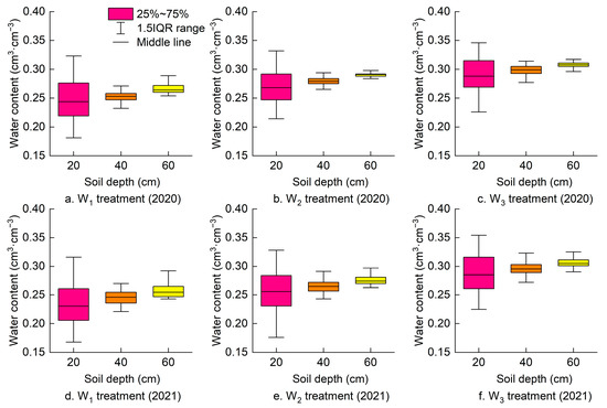 Figure 4 shows that under different water treatments, with the increase of irrigation level, the surface soil moisture content kept rising. Most soil water content data under different water treatments were within the range of 1.5 IQR (interquartile distance). The width of the box reflects the fluctuation degree of the data to some extent. In Figure 4, it can be observed that irrigation made the water soil content of the 0–40 cm fluctuate greatly, and the width of the box of 20 cm soil layer was the largest, indicating that irrigation had a significant impact on the soil water content of the 0–20 cm layer. The water content of shallow soil was lower than that of deep soil under each water treatment, which was related to water absorption of tomato roots and evaporation of the surface soil. The water content of the deep soil was large and relatively stable, which was related to the low distribution of tomato roots and the redistribution of the soil water.