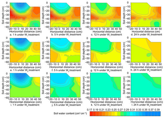Although the amount of water up to the withering point is theoretically considered to be effective water, the amount of water absorbed by crops decreases significantly before the withering point appears. When soil water content is very low, soil water is tightly bound to the surface of the soil, and soil water is difficult to be absorbed by crops. When the soil water content drops to a critical level, the water in the soil no longer flows rapidly to the roots to meet the transpiration needs of the crops, and the plants begin to face water stress [37]. According to the soil texture data given by the UNSODA database, the soil water content was about 0.21–0.24 cm3·cm−3 when water stress began to appear in the soil [25]. It can be seen that when the soil water content was lower than this value, the tomato roots were in a state of stress. Under W1 treatment, the soil-water-deficit areas on the day before three irrigations were 1848.67 cm2, 2209.37 cm2, and 2148.76 cm2. Under W2 treatment, the soil-water-deficit areas on the day before three irrigations were 903.65 cm2, 881.75 cm2, and 1200.73 cm2. W3-treated soil was almost always moist. Therefore, soil water distribution is greatly affected by water absorption by crop roots. Hence, it is of great significance to explore the laws of root water uptake and the characteristics of soil water movement for water-saving irrigation.