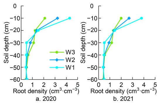 Root density (cm3·cm−3) of tomatoes in the 0–60 cm soil layer under different water treatments, in 2020 and 2021.