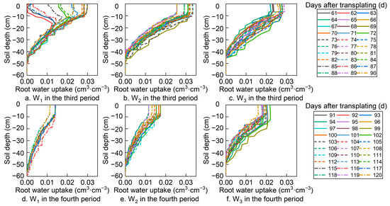 The blooming and setting stage (the third period) and the fruiting stage (the fourth period) of tomatoes were the periods when the roots were more active in water uptake. Figure 7 shows the root water uptake of tomatoes in the blooming and setting stage and fruiting stage in 2020. Under the same water treatment, the water absorption of roots in the blooming and setting stage was higher than that in the fruiting stage. This was because as the plants began to age in the later stage, the leaf appeared curled up, and the decrease of leaf area led to the decrease of plant transpiration, thus reducing the root water uptake. Under different water treatments in the blooming and setting stage and fruiting stage, the water absorption of tomato roots was mainly concentrated in the 0–20 cm layer. This was because the 0–20 cm soil layer was the area with the highest root density, so 0–20 cm was the main water uptake layer of tomatoes. W1 water treatment was irrigated on 16 May (the 63rd day of transplantation). One day before irrigation (the 62nd day of transplantation), the water absorption of tomato roots was mainly concentrated in the 10–30 cm soil layer, while the roots of the 0–10 cm soil layer did not absorb water at all. This was due to the decrease of soil water content caused by water uptake of surface roots and soil evaporation. Water deficit inhibited the water absorption of surface roots. At this time, tomatoes would absorb soil water through deep roots to maintain their life activities. Studies have shown that when the water content of the surface soil with high root density decreases, crops would increase the water absorption rate of the deep roots to compensate [18]. In the next irrigation, the water absorption rate of 0–10 cm roots reached 0.03 cm3·cm−3, indicating that water deficit promotes the water absorption of surface roots in the next irrigation to some extent.