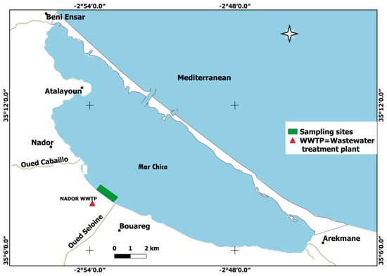 - Rahhou, A.; Layachi, M.; Akodad, M.; El Ouamari, N.; Aknaf, A.; Skalli, A.; Oudra, B.; Baghour, M. Assessment of the Trophic Status of Marchica Lagoon (Ne Morocco, Mediterranean) After Restoration Activities Using Trophic Index (Trix): Seasonal and Spatial Variations. Appl. Ecol. Environ. Res. 2022, 20, 4667–4679. [Google Scholar] [CrossRef]