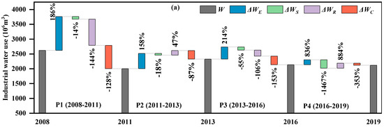 To measure the effects of the various factors on the changes in industrial water use from both the total industry and sectoral perspectives, the degrees of the contributions of the various factors were calculated according to the change in industrial water use. The equation [19] can be written as follows: