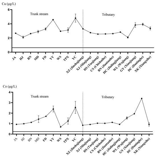 Spatial variance of Cu and Co (μg/L) concentrations in the sampling stations of the Yangtze River. The horizontal and solid lines in the figure represent the background values in historical documents. The x-axis is the sampling point. The left side of the vertical dotted line is the main stream and the right side is the tributaries of the Yangtze River. The y-axis is the element concentration.
