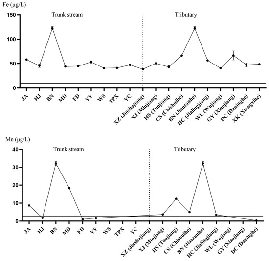Spatial variance of Fe and Mn (μg/L) concentrations in the sampling stations of the Yangtze River. The horizontal and solid lines in the figure represent the background values in historical documents. The x-axis is the sampling point. The left side of the vertical dotted line is the main stream and the right side is the tributaries of the Yangtze River. The y-axis is the element concentration.