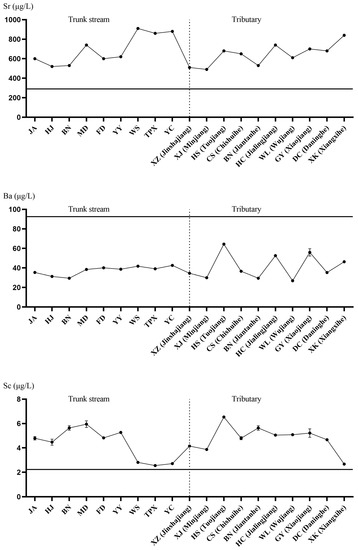 Spatial variance of Li, Sr, Ba and Sc (μg/L) concentrations in the sampling stations of the Yangtze River. The horizontal and solid lines in the figure represent the background values in historical documents. The x-axis is the sampling point. The left side of the vertical dotted line is the main stream and the right side is the tributaries of the Yangtze River; The y-axis is the element concentration.