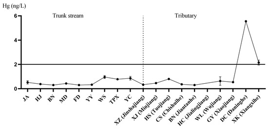 Spatial variance of Hg (ng/L) concentrations in the sampling stations of the Yangtze River. The horizontal and solid lines in the figure represent the background values in historical documents. The x-axis is the sampling point. The left side of the vertical dotted line is the main stream and the right side is the tributaries of the Yangtze River. The y-axis is the element concentration.