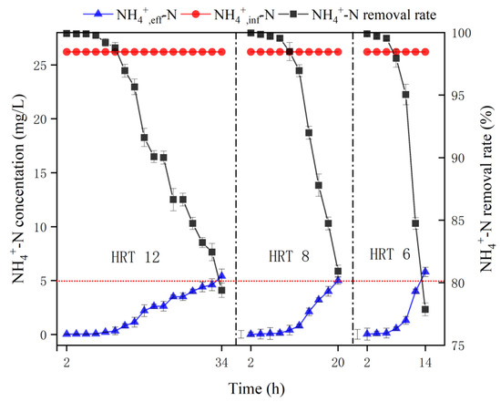 In the adsorption stage, the adsorption breakthrough curves of the MBBR treating -N wastewater with a concentration of 26.2 mg/L under different HRT conditions are shown in Figure 2. As can be seen from Figure 2, the breakthrough point for -N adsorption was ≤5 mg/L, and the breakthrough times were 34th, 20th, and 14th h for HRT of 12, 8, and 6 h, respectively. It can be concluded that the shorter the HRT, the shorter the adsorption breakthrough time of ammonia nitrogen, which is probably due to the fixed adsorption capacity of bio-ceramsite. The shorter the HRT, the higher the input flow rate and the larger the input ammonia nitrogen, which can exceed the ammonia nitrogen adsorption capacity of the reactor ceramsite in a short period of time.