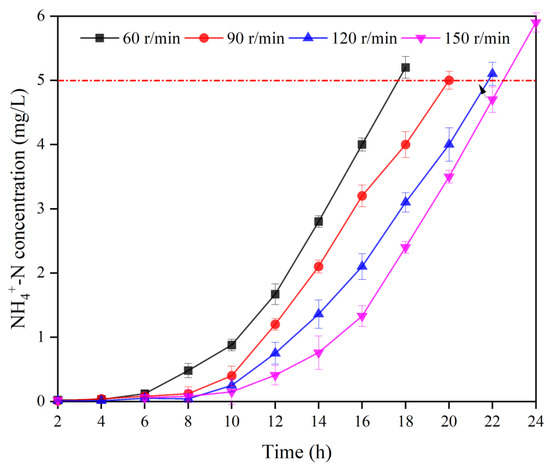 The HRT was set to 8 h, and the stirrer speed was controlled at 60, 90, 120, and 150 r/min, and the changes in -N concentration in the effluent were monitored every 2 h. The effect of different stirring speeds on the breakthrough time of the MBBR ammonia and nitrogen adsorption was investigated to determine the best stirring speed.