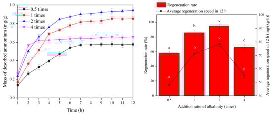 Desorption of ammonia nitrogen adsorbed on ceramsite is a prerequisite for the MBBR to proceed to the next adsorption operation. In this study, the biofilm attached to the ceramsite was used for regeneration by a shortcut SND process. In this process, NaHCO3 not only supplies the alkalinity to the nitrification reaction but also replaces the ammonia nitrogen adsorbed by the zeolite component of ceramsite via ion exchange, which acts as a chemical regeneration for the bio-ceramsite. Figure 4 shows the effect of the regeneration of bio-ceramsite with different alkalinity addition ratios.