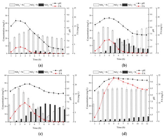 It can be found from Figure 5 that the alkalinity addition ratios were closely related to the variation of each form of nitrogen in the MBBR, and there was a complex connection between the variation of these nitrogen forms and pH, as well as FA concentration. The pH of each reactor showed a trend of increasing to the maximum value first and then decreasing after a period of time. The reasons for the increase in pH at the beginning stage may be related to the following factors. On the one hand, the high concentration of organic matter at the beginning of the reaction, the number of heterotrophic bacteria is much more than that of autotrophic bacteria such as AOB and NOB, and the decomposition and metabolism of COD by heterotrophic microorganisms will produce CO2, while the constant aeration will blow off CO2, which leads to the increase in pH in the MBBR [35]. On the other hand, the alkalinity produced by denitrification in the reactor is larger than that consumed by nitrifying bacteria, which causes a further increase in pH [36]. When the alkalinity produced by denitrification, the alkalinity produced by aeration blow-off, and the alkalinity consumed by nitrification are equal, the pH of the system will reach the maximum value and remain unchanged for an extended period of time. Ultimately, the pH in the MBBR will start to decrease with the enhancement of nitrification and weakening of denitrification and the reduction of CO2 blow-off in the later stage of the reaction.
