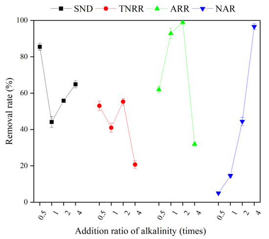 Generally speaking, in the SND process, for every 1 g -N oxidized by nitrifying functional bacteria in terms of CaCO3, 7.14 g of alkalinity needed to be consumed; for every 1 g -N restored by denitrifying functional bacteria, only 3.57 g of alkalinity can be produced [27]. The consumption of alkalinity for the nitrification reaction needed to be supplemented by the addition of NaHCO3 during the stage of denitrification and regeneration in the reactor, and the theoretical alkalinity (ALK) can be calculated with the following formula.