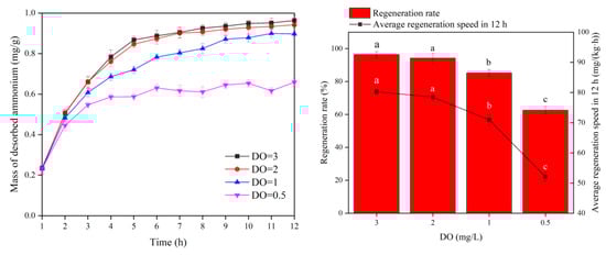 From the above results, it is clear that different DO levels are closely related to the desorption of ammonia nitrogen. The worst desorption effect was observed at DO of 0.5 mg/L, which may be related to the decrease in nitrification rate because of low DO conditions. The biological desorption of ammonia nitrogen adsorbed by ceramsite was affected by the low activity of nitrifying bacteria on the biofilm [45]. Then, with the increase in DO concentration, the nitrification rate of biofilm increased, and the regeneration effect of ceramsite was significantly enhanced. When the DO concentration exceeded 1 mg/L, the bio-regeneration rate of ceramsite was above 85%, suggesting that DO was not the speed-limiting factor of nitrification at this time.