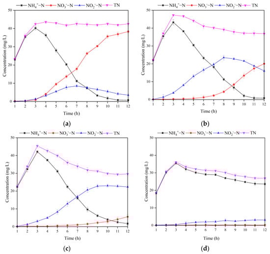 At 0.5 times alkalinity, the nitrification reaction was not complete enough. At the end of the reaction, -N was the primary form of nitrogen and the proportion of ammonia nitrogen reached 80.8%. The reason is that 0.5 times alkalinity is not enough to compensate for the consumption of alkalinity in the nitrification reaction, resulting in a system pH of only about 6.33 at the late stage of the reaction [37]. Moreover, the low pH denatures and inactivates the proteins related to the enzymatic reaction inside the nitrifying bacteria, which greatly reduces the efficiency of the nitrification reaction [38].