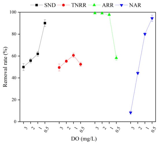 At DO of 1 mg/L, the variation trend of -N was similar to that at DO of 2 mg/L and 3 mg/L. At the end of the reaction, the concentration of -N was 1.7 mg/L and the ARR was 97.7%. However, the accumulation of -N was much higher than that of in the whole reaction process, and the NAR remained at 80.1% at the end of the reaction, demonstrating that the shortcut nitrification process obtained by maintaining a low DO is stable and durable. Huang and Lee [47] showed that the oxygen saturation constant for AOB was 0.2–0.4 mg/L, while that for NOB was 1.1–1.5 mg/L. When the DO is 1.0 mg/L, the difference in dissolved oxygen demand between AOB and NOB can be used to remove the vast majority of NOB from the reactor. However, due to the lack of a carbon source, even if a stable shortcut nitrification process was achieved, there were still a lot of -N residues at the end of the reaction, and the SND rate and TNRR were only 62.0% and 60.6%, respectively.