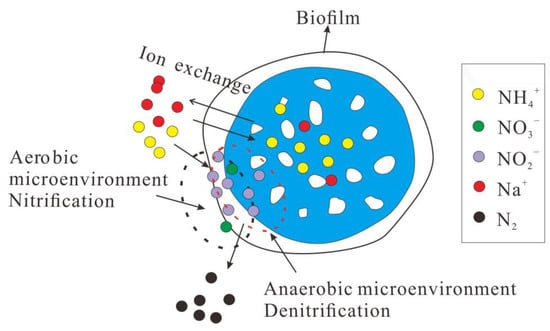 In the shortcut SND denitrification and regeneration stage, the bio-ceramsite was not only the adsorption material but also the carrier of nitrifying bacteria and denitrifying bacteria. The shortcut SND process involving microorganisms played an important role in the desorption of ammonia nitrogen. On the one hand, the alkalinity applied by the nitrification process provided a “Na+ pump” for the desorption of adsorbed ammonia nitrogen from bio-ceramsite. Na+ in these liquid phases exchanged the adsorbed by ceramsite zeolite component. On the other hand, nitrifying bacteria in ceramsite biofilms simultaneously oxidized the adsorbed -N in the liquid phase and outer layer of the zeolite component, promoted the outward diffusion of -N inside the zeolite, and accelerated the desorption of -N. In the initial stage of denitrification and regeneration, ion exchange was the main driving force of biochemical desorption. At this time, due to the high concentration of Na+ in the liquid phase and the exchange occurring in the surface structure of the ceramsite zeolite component, the exchange rate was relatively fast, which mainly depended on the rate of Na+ crossing the biofilm [51]. In the late stage of denitrification regeneration, in the outer layer structure of ceramsite zeolite components were replaced by cation exchange such as Na+, and Na+ gradually diffused to the internal channels of the zeolite component. Ion exchange becomes difficult due to the decrease in Na+ concentration in the liquid phase, the increase in electrostatic repulsion, and the narrowing of zeolite component pore size in ceramsite, and the nitrification of microorganisms become the main driving force for the later denitrification and regeneration [52].