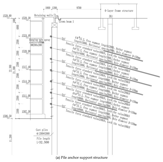 Support pile is a commonly used support method in foundation pit engineering, which mainly bears the active earth pressure of the foundation pit and combines with the crown beam to form a stable support structure [20,21]. The plane size of the foundation pit is large, and the working space is sufficient, so a reinforced concrete support pile + prestressed anchor cable is used to form an effective support scheme.
