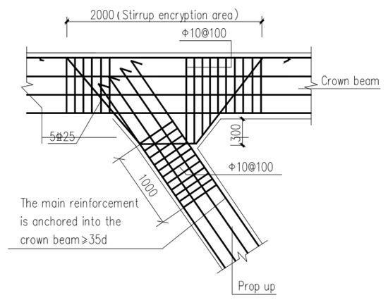 Considering the safety, economy, and stability of the foundation pit, the A–E sections are connected by an angle brace, and Figure 4 is the construction drawing of the corner brace site. The primary function of the crown beam is to communicate between stressed members and structure’s integrity, and the node connection is shown in Figure 5.