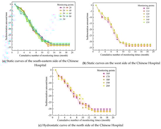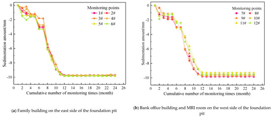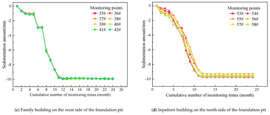 For monitoring different buildings, the monitoring results are shown in Table 4, and the maximum cumulative settlement is displayed for different measurement results of the same building; see Figure 23 for details. Due to the large area of the family hospital on the west side of the foundation pit, has a significant impact on the foundation pit, so it is divided into 6 groups of different location measurement points for monitoring. The inpatient building on the north side of the foundation pit is monitored in two groups of varying location measurement points.