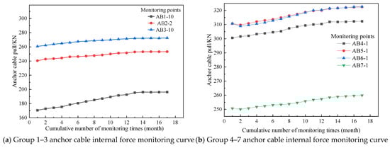 Figure 21 shows the value of the internal force of the anchor cable in the pit. For the anchor cable in the pit, the frequency of each monitoring point is measured by a vibrating string strain gauge (the vibrating string gauge has several vibrating string strain gauges distributed on the force measuring cylinder. The electromagnetic coil excites the vibrating chord and measures its vibration frequency. The frequency signal is transmitted via cable to the reading device, where the strain variable causing the deformation of the stressed steel cylinder can be measured and the load value felt by the anchor cable gauge can be calculated by substituting the calibration coefficient.) The load values are calculated and 7 sets of internal force monitoring points are arranged for the anchor cable internal force monitoring in the pit.