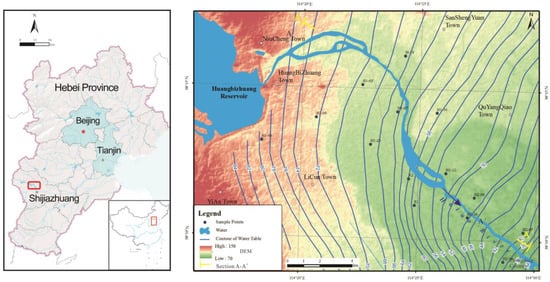 The Hutuo RBF area is located in the North China Plain. The river began to dry up after 1980, and the rainy season did not contribute much water. The investigation site covers the area from Huangbizhuang Town (in southwestern Hebei Province, China), to Zhengding County in the middle and lower reaches (38.15°–38.31° N, 114.21°–114.49° E), with an approximate area of 236.88 km2 (Figure 1). The temperate semi-humid and semi-arid continental monsoon climate is the dominant climate type in this region. The upstream average temperature for many years has been 6.4 °C. The average annual precipitation is 484.0 mm, whereas the spatial and temporal distribution of precipitation is uneven [,]. The rainy season (from June to August) accounts for 70–85% of the total annual rainfall []. The study area is located in the upper of the Hutuo River alluvial fan. The eastern part of this region is the groundwater divide, and the Huangbizhuang Reservoir is situated northwest of this zone. The groundwater in the study area flows from the northwest to the southeast, and the flow direction changes a little before and after water replenishment.