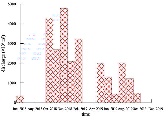 With a severe drought condition in the Hutuo river, the study area is mainly recharged by the discharge of the Huangbizhuang Reservoir that implements a non-sustainable water drainage measure. The water drainage operation is carried out within a few months before the rainy season. Most of the water released leaks into the groundwater layer through the river channel, while the rest continues to flow to the downstream area. Hence, the study area is considered as the infiltration site. From 2018 to 2020, water had been intermittently recharged in the upper of the Hutuo River. The amount of monthly reservoir water discharge is shown in Figure 3. In June 2018, the amount of reservoir discharge was 352 × 104 m3. From October 2018 to February 2019, the discharge of reservoir water reached its peak, of which the maximum discharge was 0.478 × 108 m3 in December 2018. The total amount of water discharge in 2018 was 1.21 × 108 m3. Draining was not observed in March, April, November, and December of 2019. The maximum amount of water discharge and the total water discharge were 0.323 × 108 m3 and 1.21 × 108 m3, respectively, in 2019. The reservoir water release in 2019 was 900 × 104 m3 more than that in 2018. From June 2018 to December 2019, the total accumulated water release of the reservoir was 2.51 × 108 m3, with an average monthly replenishment of 0.13 × 108 m3.