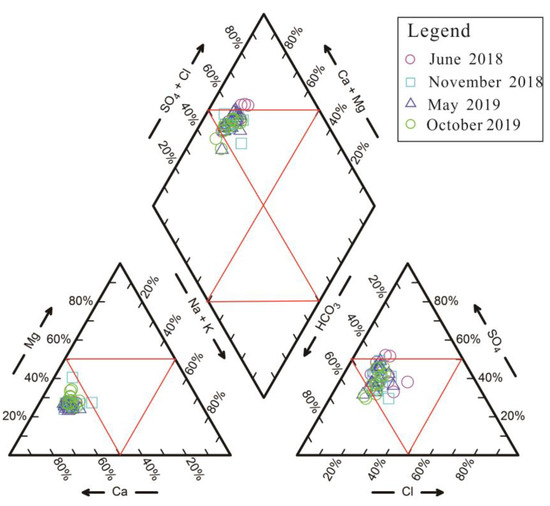 The Piper diagram has not been disturbed by human subjective factors [], and is a common method to identify the main ion composition of water chemistry [,]. Piper plots are created using the main ion data for groundwater in the study area (Figure 4). Two samples in October 2019 (late recharge) and one sample in May 2019 (intermediate recharge) are scattered in the zone of the left lower triangle predominated by the bicarbonate-type. Two samples in June 2018 (pre-recharge) are scattered in the zone of the upper triangle where the sulfate-type predominates. The central diamond plot provides important information to discriminate between separate groups of samples. Most samples are scattered in the mixed-type zone, and such samples are the most common in groundwater chemistry in the recharge period. From June 2018 (pre-recharge) to October 2019 (late recharge), groundwater types in the study area were mainly Ca-Mg-HCO3-SO4 and Ca-Mg-SO4-HCO3, with no obvious change in chemistry. The results of the Piper plot reveal Ca2+ and Mg2+ as the main groundwater cations in the study area, and the Ca2+ content is the highest. Cation contents follow the order Ca2+ > Mg2+ > Na+ + K+. The anions are mainly HCO3− and SO42−.