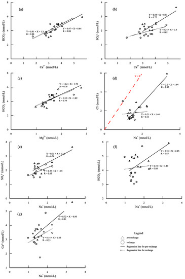 The correlation between anions and cations and changes of the correlation coefficient can be used to reasonably speculate geochemical processes such as rock–water interaction [,]. In accordance with the drilling core test results and previous studies, the aquifer contains calcite, dolomite, rock salt, gypsum, and mirabilite in the study area [,,,]. The scale relationship of the main ions is plotted (Figure 5), and the correlation coefficients between different ions for each group of water samples are obtained. The scatter plot of Ca2+ and HCO3− (Figure 5a) shows that the two groups of groundwater samples, pre-recharge (R = 0.88) and recharge (R = 0.88), are strongly correlated. These two groups of water samples may have experienced weathering and dissolution of calcite, and this hydrogeochemical process can be expressed as R1. The scatter plots for Ca2+ and SO42− (Figure 5b) exhibit well-correlated groundwater samples for the pre-recharge (R = 0.77) group. Weathering and dissolution of gypsum during the formation of groundwater in this group is a highly important hydrogeochemical process, and the reaction is expressed as R2. The scatter plot of Mg2+ and HCO3− (Figure 5c) demonstrates two well-correlated groups of groundwater samples, pre-recharge (R = 0.78) and recharge (R = 0.79). The sample may have undergone dolomite dissolution, and the expression for this reaction is R3. The scatter plot for Na+ and HCO3− (Figure 5f) shows that pre-recharge (R = 0.65) is slightly correlated, whereas the pre-recharge groundwater (R = 0.91) is well correlated between Ca2+ and Na+ (Figure 5g). The pre-recharge groundwater group experiences calcite dissolution and cation exchange. That is, Ca2+ in groundwater exchanges the adsorbed Na+ during rock formation. The correlation between Na+ and SO42− in the pre-recharge groundwater group (R = 0.78) is good (Figure 5e). The dissolution of mirabilite may affect the distribution of chemical elements in the pre-recharge groundwater group. The dissolution reaction equation for mirabilite is shown in R4. The pre-recharge groundwater group (R = 0.95) has strong correlations in the scatter plots for Na+ and Cl− (Figure 5d). The dissolution of salt rock also occurs in this group and is expressed as Equation R5.