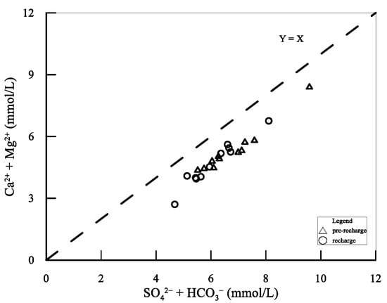 Samples close to the 1:1 equilibrium line in (Ca2+ + Mg2+)/(HCO3–) and (Ca2+ + Mg2+)/(SO42–) are obvious evidence to conclude that Ca2+ and Mg2+ in the groundwater mainly come from sulfate dissolution [,,]. The samples are mostly distributed above the straight line 1:1 (Figure 8). This indicates the occurrence of short-term dilution after the recharge of the reservoir, and also an increase in the salt leaching and filtration of groundwater, in addition to the cation exchange effect.