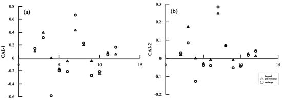 Figure 7 shows the changes in CAI-1 and CAI-2 indices for the two groups of water sampling points. Most of the water sample points are greater than 0 from the perspective of the CAI index, except for a few points where indices are less than 0. Some pre-recharge and few recharge points are ion exchange between Ca2+ or Mg2+ in the groundwater and Na+ in the aqueous medium, and most of the points are ion exchange between Na+ in the groundwater and Ca2+ or Mg2+ in the aqueous medium. The average values of CAI-1 and CAI-2 of the water sampling points reveal that the pre-recharge samples are slightly lower than that of the recharge group, and the intensity of ion exchange in the recharge stage is higher than that of the pre-recharge stage.