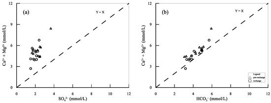 Correlation comparison of (Ca2+ + Mg2+)/HCO3− and (Ca2+ + Mg2+)/SO42−. (a) Relationship between SO42− and (Ca2+ + Mg2+). (b) Relationship between HCO3− and (Ca2+ + Mg2+).