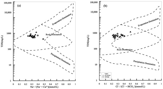 Gibbs diagram of the research area. (a) The relationship between Na+/(Na+ + Ca2+) and TDS. (b) The relationship between Cl−/(Cl− + HCO3−) and TDS.