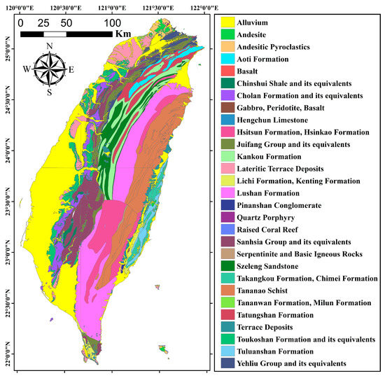 The long-term average annual rainfall in Taiwan was estimated at 2510 mm, but that in 2013–2020 was estimated at 2454 mm based on the open data information on the Water Resources Agency website [35]. The characteristic of annual rainfall in the past 2 decades in Taiwan was obvious oscillating. The average annual rainfall in 2014 and 2016 in Taiwan was 1921 mm and 3278 mm, and the difference between the annual rainfall in 2014 and 2016 was 1357 mm, i.e., 54.0% of the long-term average annual rainfall. The geological settings in Taiwan are shown in Figure 2. The terrace deposits (21.7%), alluvium (8.8%), and Sanhsia group and its equivalents (7.7%) were the three main geological settings in Taiwan. The main stratigraphical formations in the northern central mountain region include the Oligocene-era Aoti formation, Oligocene-era Kankou formation, Eocene-era Szeleng sandstone, and Oligocene-era Tatungshan formation, and those in the southern central mountain region include Eocene-era Hsitsun Formation, Hsinkao Formation, Miocene-era Lushan Formation, late Miocene-era Sanhsia group and its equivalents, and late Paleozoic-era Tananao schist. Most landslides were concentrated in central and southern Taiwan, especially in the five landslide-prone stratigraphical formations, including the Changchihkeng Formation, Chaochou Formation, Pilushan Formation, Lushan Formation, and Tayuling Formation. The occupied percentage of the five landslide-prone stratigraphical formations in Taiwan is <30%, but the landslide area within the five landslide-prone stratigraphical formations after 2009 Typhoon Morakot occupied >70% of the all landslide areas in Taiwan. The main composition in the five landslide-prone stratigraphical formations are sandstone, shale, and slate. Detailed information of geological settings in Taiwan is also shown in Supplementary Materials.