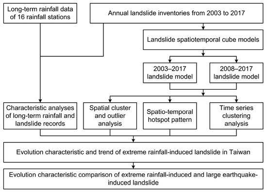 The purpose of this study was to explore and explain the long-term evolution characteristics of rainfall-induced landslides at the subwatershed scale in Taiwan using annual landslide inventories from 2003 to 2017 and spatiotemporal hot spot technology. Knowing the long-term evolution characteristic of landslides can contribute to planning the correct engineering in the correct place to prevent secondary geological hazards, especially in a watershed with dense landslide distribution. The long-term rainfall records from 16 rainfall stations for the period 2003–2017 were collected, and the relationship between rainfall and landslide evolution was analyzed. Two spatiotemporal landslide cube models were developed in this study. The first was based on the annual landslide inventories from 2003–2017 and was used for exploring the long-term evolution of landslides in Taiwan. The other model was based on the annual landslide inventories from 2008–2017 and used to explore the long-term evolution of landslides caused by Typhoon Morakot in 2009. Moreover, the complete set of hot spots was statistically analyzed. We used spatial cluster and outlier analysis to explore the spatial and temporal distribution of landslides in Taiwan and the emerging hot spot analysis tool to explore the spatial and temporal hot spot patterns of landslides in Taiwan. We also determined the spatial and temporal distribution of landslide recovery after extreme rainfall-induced landslide events and compared it with that after major earthquake-induced landslide events.