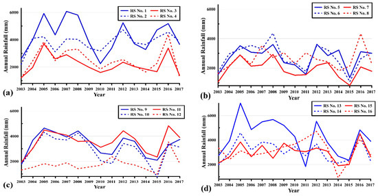 Temporal distribution of annual rainfall in the rainfall stations no. 1–4 (a), no. 5–8 (b), no. 9–12 (c), and no. 13–16 (d) in 2003–2017 in Taiwan.