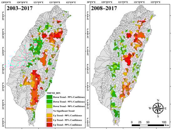 The Mann–Kendall trend test for the landslide cube model in 2003–2017 (left) and 2008–2017 (right).