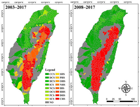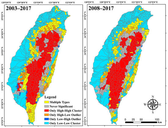 A total of 447 and 502 subwatersheds were identified as significant spatial clusters (only high–high and only low–low) in the 2003–2017 and 2008–2017 landslide models, respectively. The only high–high cluster was distributed in the central mountainous region of south Taiwan in 2003–2017 and 2008–2017. This finding indicates that the central mountainous region in southern Taiwan was an originally landslide-prone region. The number of subwatersheds identified as having multiple types of patterns was 214 in 2003–2017 and decreased to 137 in 2008–2017; by contrast, the number of subwatersheds designated as never significant increased from 101 to 142, and the number designated as only the low–low cluster type increased from 241 to 305. The subwatersheds designated as multiple types in 2003–2017 and later identified as never significant, and only the low–low cluster type in 2008–2017 were mainly distributed in northern Taiwan. The number of subwatersheds designated as only the high–high cluster type in the 2008–2017 landslide model in north Taiwan was smaller than that in the 2003–2017 landslide model. This result indicated that the landslide recovery rate in northern Taiwan was gradually improving because the sediment deposition disaster caused by Typhoon Morakot was mainly distributed in southern Taiwan (see the annual landslide distribution in 2009–2017 in Supplementary Materials). The number of subwatersheds marked as only high–low outliers declined from 2003–2017 to 2008–2017, and these subwatersheds were mainly distributed in the piedmont regions across Taiwan. Only nine and five subwatersheds were designated as only low–high outliers in the 2003–2017 and 2008–2017 landslide models, respectively, and these subwatersheds were mainly distributed in southern Taiwan.