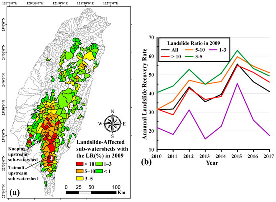 The landslide recovery rate in the landslide-affected subwatersheds in the study was estimated to assess the actual landslide recovery after Typhoon Morakot in Taiwan. Subwatersheds were defined as “landslide affected” if their landslide ratio in 2009 was larger by at least 0.3% than that in 2008. The 278 landslide-affected subwatersheds were distributed in southern Taiwan (Figure 9). The mean landslide ratio in the 278 landslide-affected subwatersheds in 2009 was larger by 2.86% than that in 2008. The annual landslide recovery rates of the landslide-affected subwatersheds from 2010 to 2017 are shown in Figure 9. The landslide recovery rate of 278 landslide-affected subwatersheds in the first to second years after Typhoon Morakot was 31.6%, and that in the sixth to eighth years was 47.7%. The recovery rate of landslides induced by extreme rainfall events in Taiwan was larger than that of landslides induced by large-scale earthquake events in the world [10,42]. The landslide recovery rate of the subwatersheds with a landslide ratio >3.0% in 2009 was larger than that of all landslide-affected subwatersheds. By contrast, the landslide recovery rate of the subwatersheds with a landslide ratio <3.0% in 2009 was lower than that of all landslide-affected subwatersheds. Furthermore, the landslide recovery rate of the subwatersheds with a landslide ratio >3.0% in 2009 in the first two years after Typhoon Morakot was 35.4%, and that in the sixth to eighth years was 53.7%. The trend of the landslide recovery rate increased after Typhoon Morakot, but the landslide recovery rates in 2013, 2016, and 2017 showed a declining trend.