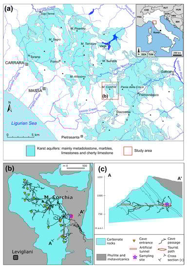 - Piccini, L.; Mantelli, F.; Montigiani, A.; Cecconi, E.; Lotti, L. Idrogeologia del sistema carsico del Monte Corchia: Sintesi dei dati e delle attuali conoscenze. Acta Apuana 2015, 2012, 23–32. [Google Scholar]