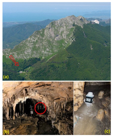 The karst complex of Mount Corchia, i.e., the part of the system known thanks to speleological explorations, is affected by a dense network of percolation and concentrated runoff routes, which gathers in a single collector which can be followed by the north-western part of the karst complex, up to the bottom of the cave, at an altitude of 450 m a.s.l. (Figure 1b). The Corchia Cave (44°01′31.98″ N 10°17′59.64″ E; Figure 1), the subterranean system (more than 70 km in length and 1185 m in vertical range) of Mount Corchia (the formation of which dates back to the Late Pliocene, about 2.6 million years ago), is one of the most extensive and deepest caves in Europe [30]. About half of the underground three-dimensional network (from 1550 to 450 m a.s.l.) consists of relict phreatic and epiphreatic tubes intersected by a system of predominantly vertical cavities, mainly deep pits and narrow meandering passages [32].
