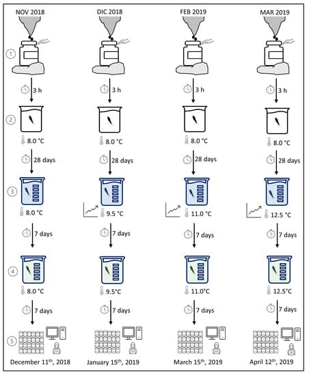 We run four respirometry trials at four temperatures (8.0, 9.5, 11.0, and 12.5 °C), where 8.0 °C is about the annual average temperature of the dripping water at the Stalactites Gallery and 12.5 °C is consistent with the worst climate-change scenario depicted for groundwaters worldwide within the next century (3–5 °C projected thermal increase [39,40,41]). The specimens used in the trials were collected in November and December 2018 and in February and March 2019, by leaving the containers in place for a minimum of 30 days and a maximum of 56 days. The trials were run about six weeks after collection: on December 11th, 2018 (trial at 8.0 °C), 15 January 2019 (trial at 9.5 °C), 15 March 2019 (trial at 11.0 °C), and 12 April 2019 (trial at 12.5 °C). The specimens were transported in a cooling box to the laboratory within 3 h of each collection (Figure 3). In the laboratory, we let the specimens acclimate to the laboratory conditions at the temperature of the collection site (8.0 °C), keeping them in 100 mL of drip water in a 250 mL glass container in permanent darkness for four weeks (Figure 3). During this period, we did not provide sediments (because we never found deposits in the collection containers) and never changed the water. At the end of the four-week acclimation at the laboratory conditions and the temperature of the collection site, we picked up the adult females with a glass pipette and loaded them into a glass vial (250 mL) with 50 mL of drip water and 50 mL of MILLIPORE MILLI-Q® ultrafiltered water (Elix®, Merck KGaA, Darmstadt, Germany), remineralized with the following reagent grade chemicals: 0.06 g of MgSO4, 0.096 g of NaHCO3, 0.004 g of KCl, and 0.06 g of CaSO42H2O [42,43]. For the measurements at 8 °C, we did not change the temperature and kept the animals in the darkness for seven days (Figure 3). For the trials run at temperatures >8.0 °C, we slowly increased the temperature by 0.041 °C/h. The desired temperatures of 9.5, 11.0, and 12.5 °C were reached in 1–3 days following Di Lorenzo and Reboleira [5]. Once the new temperature was reached, we let the specimens acclimate in the darkness for seven days. Afterward, we moved the adult females to a new 250 mL container previously filled with 100 mL of the remineralized MILLI-Q water (Figure 3). We let them acclimate for seven more days to the new medium before measuring the oxygen consumption rates at the appropriate temperature (Figure 3). Acclimation in MILLI-Q remineralized water was necessary to ensure gut emptying and avoid the overshoot of oxygen consumption by fecal bacteria during measurements [4,5,38]. We used adult females only to minimize the effect of mass, gender, and developmental stage on oxygen consumption.