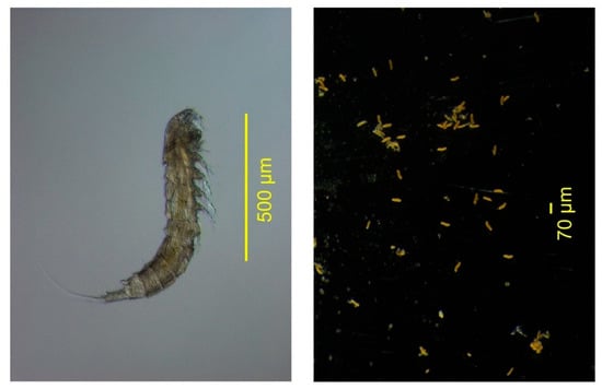 Adult female of Moraria sp. (right) and its fecal pellets (left). Moraria sp. shows stygobitic morphological traits such as lack of eyes, depigmentation, small body size, and long antennules and does not ingest the fecal pellets, which remain visible in the vial.
